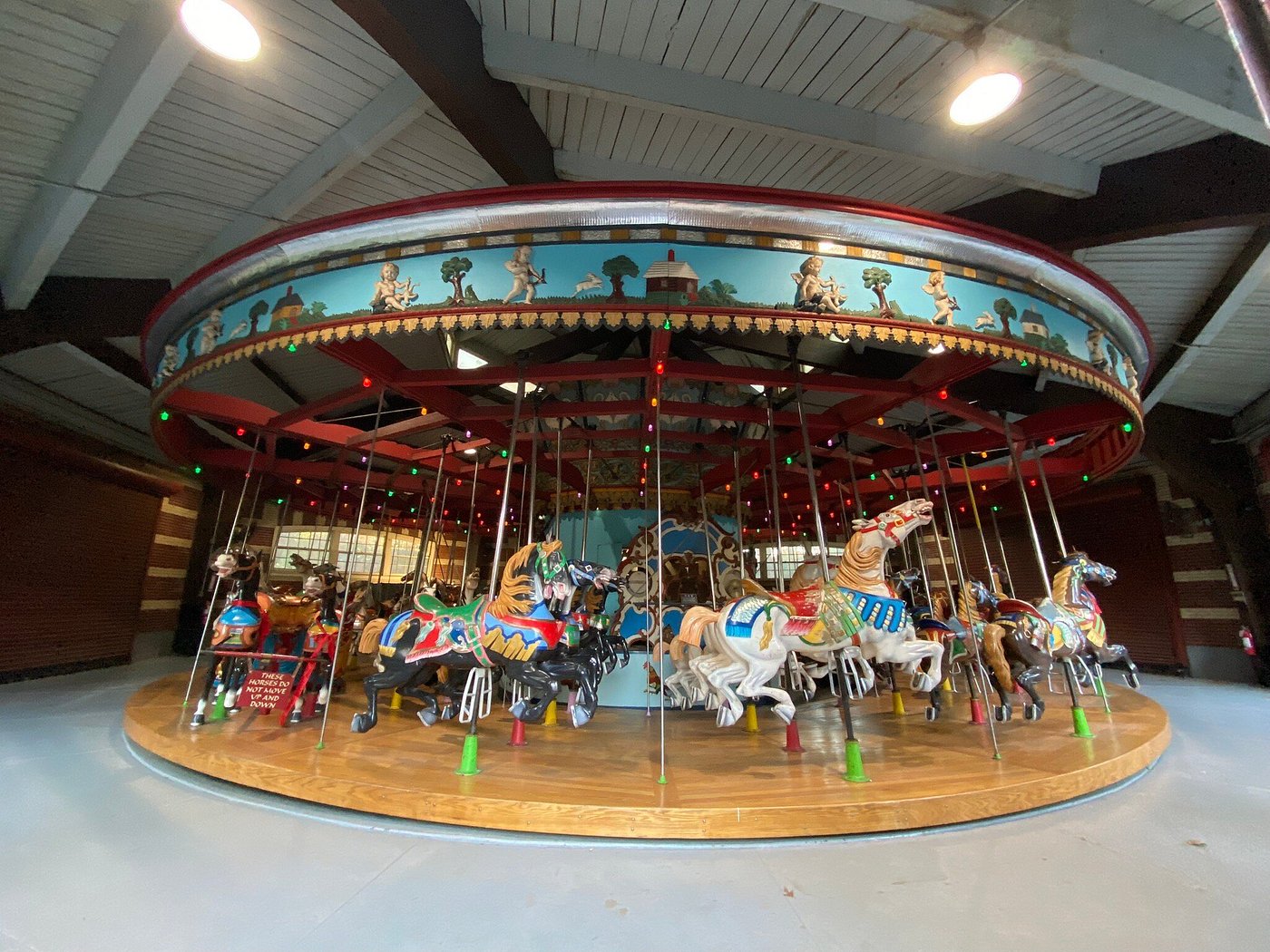 Every city we visit with a significant or historic carousel, we ride that crousel. This carousel is housed in an indoor / outdoor building so it is open year round. In the winter, you are protected from the wind and in the summer you get to feel the breeze when the large garage doors are open. The roof means you can ride it rain or shine!